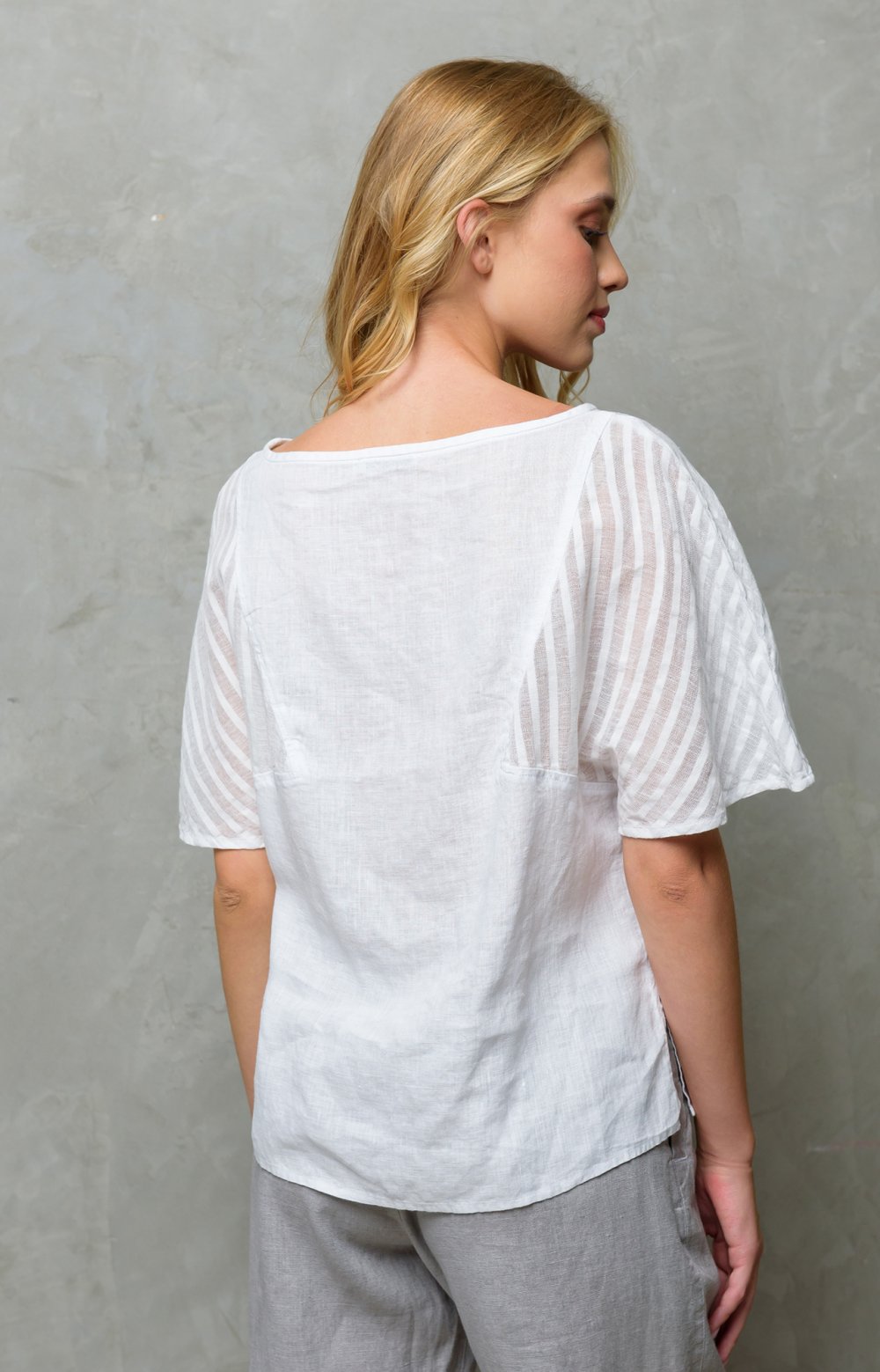 Блузка АБЕЛЕ. Лучшая блузка для лета, чтобы наслаждаться любимым временем года разработана дизайнерами AGENDA. Эксперименты с кроем пошли на пользу изделию, переведя ее из повседневной базы в ряд эффектных моделей. Резы на полочке и спинке подчеркивают графичность, и акцентируют внимание на цельнокроенных рукавах, изготовленных из фактурной ткани в полоску.