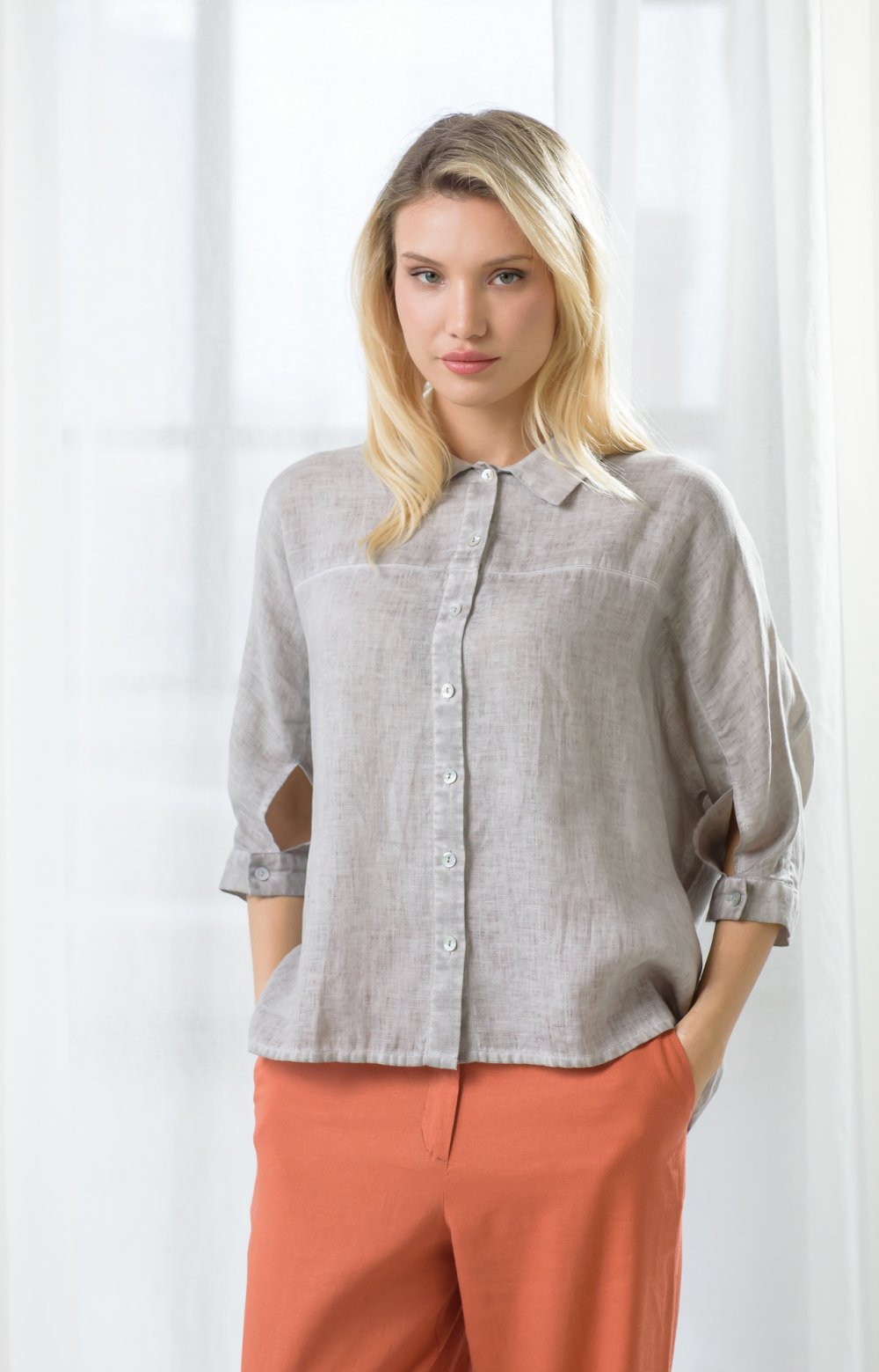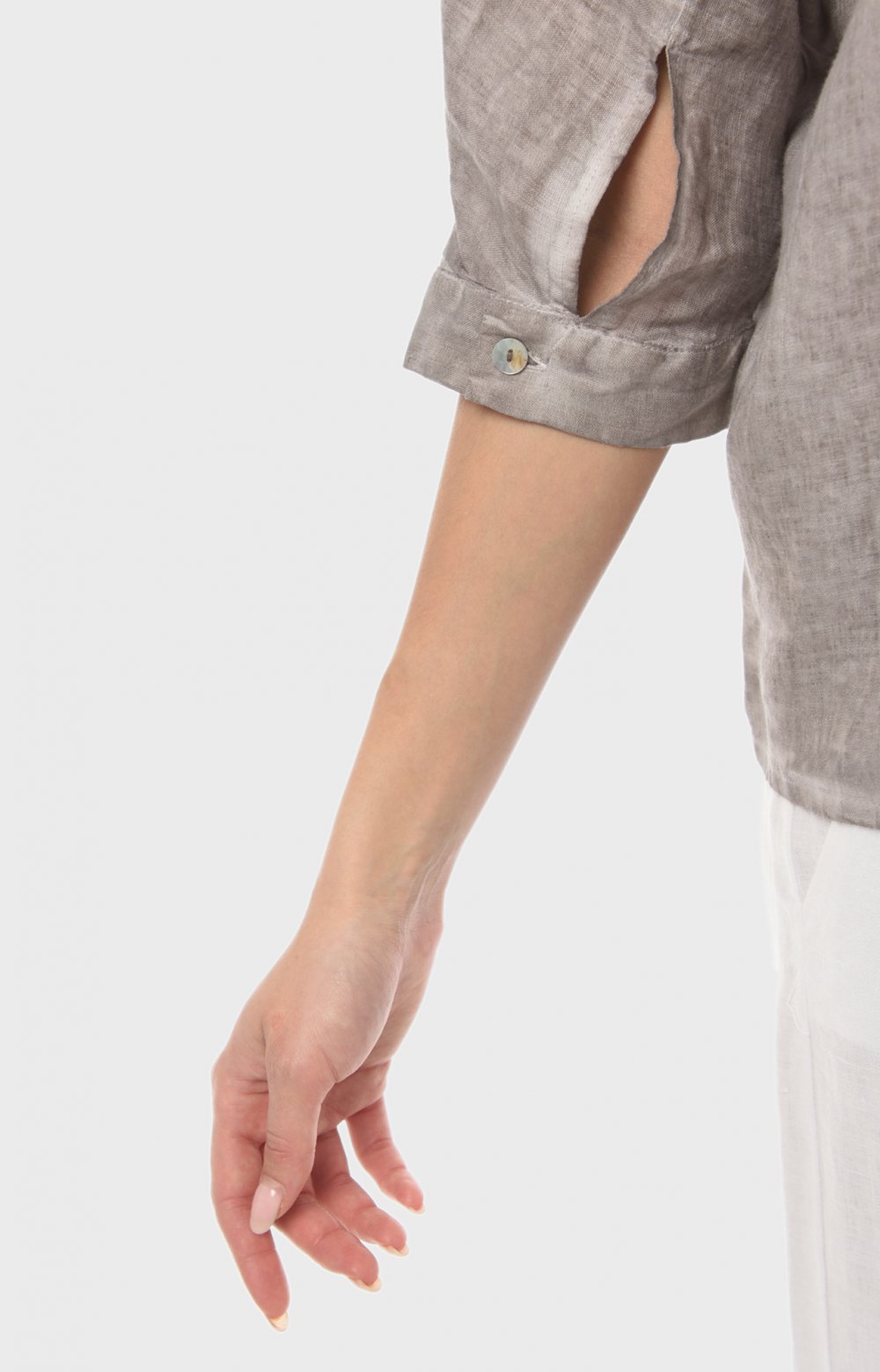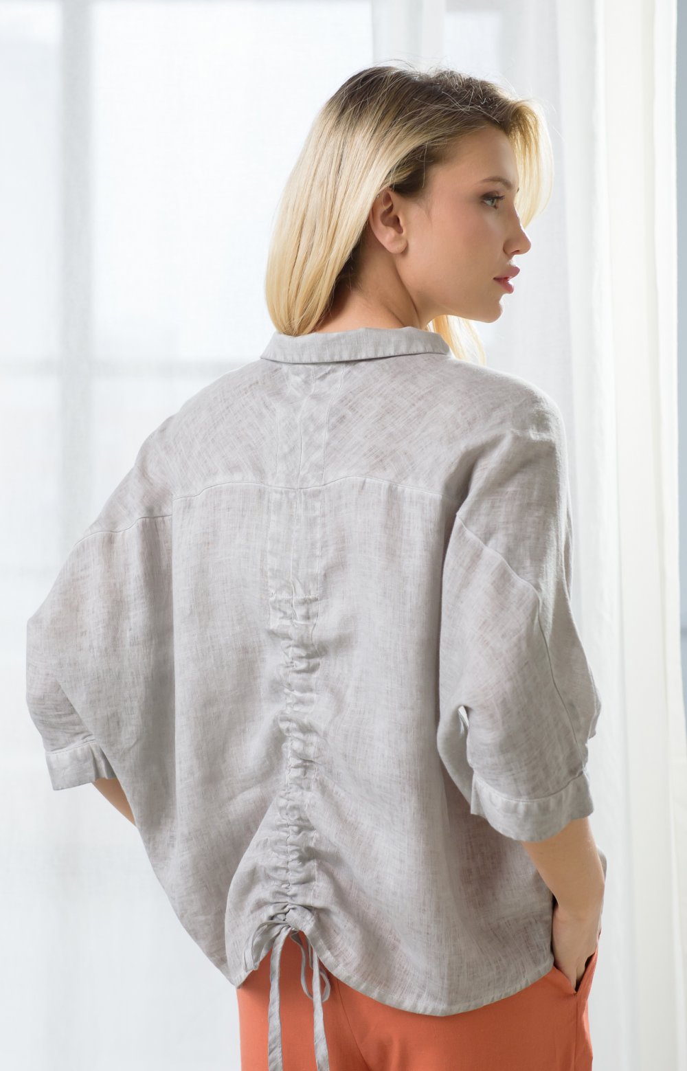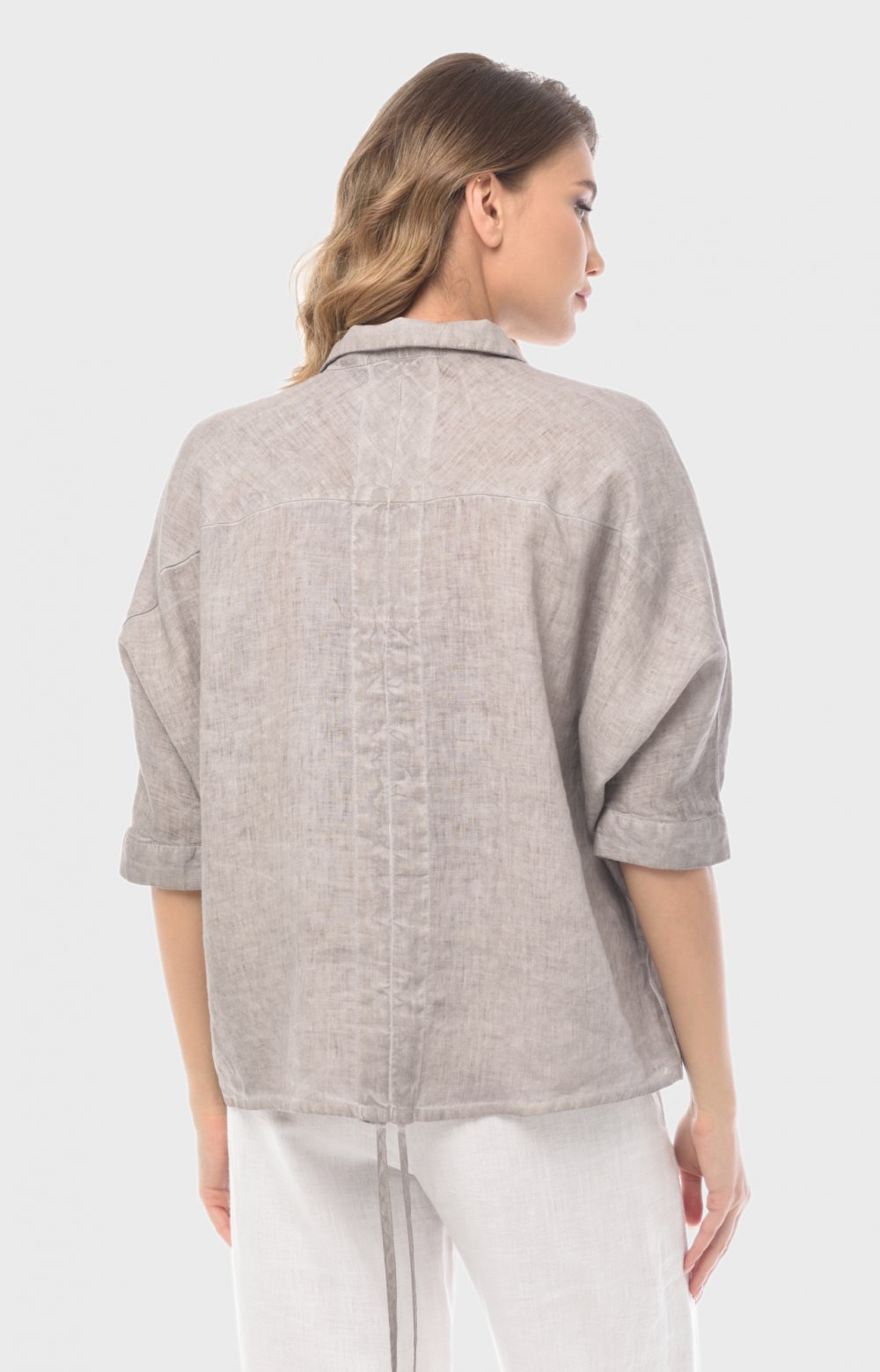 Просторная льняная модель с цельнокроеными рукавами приятно струится по телу, позволяя чувствовать себя комфортно даже в самые жаркие часы. Здесь главную роль играют детали: рез на полочке переходящий в манжет с застежкой спереди, и кулиса на спинке, позволяющая создавать эффектные волнующие драпировки. Окрашивание подчеркивает дизайнерские линии кроя и аутентичную фактуру льняной ткани.