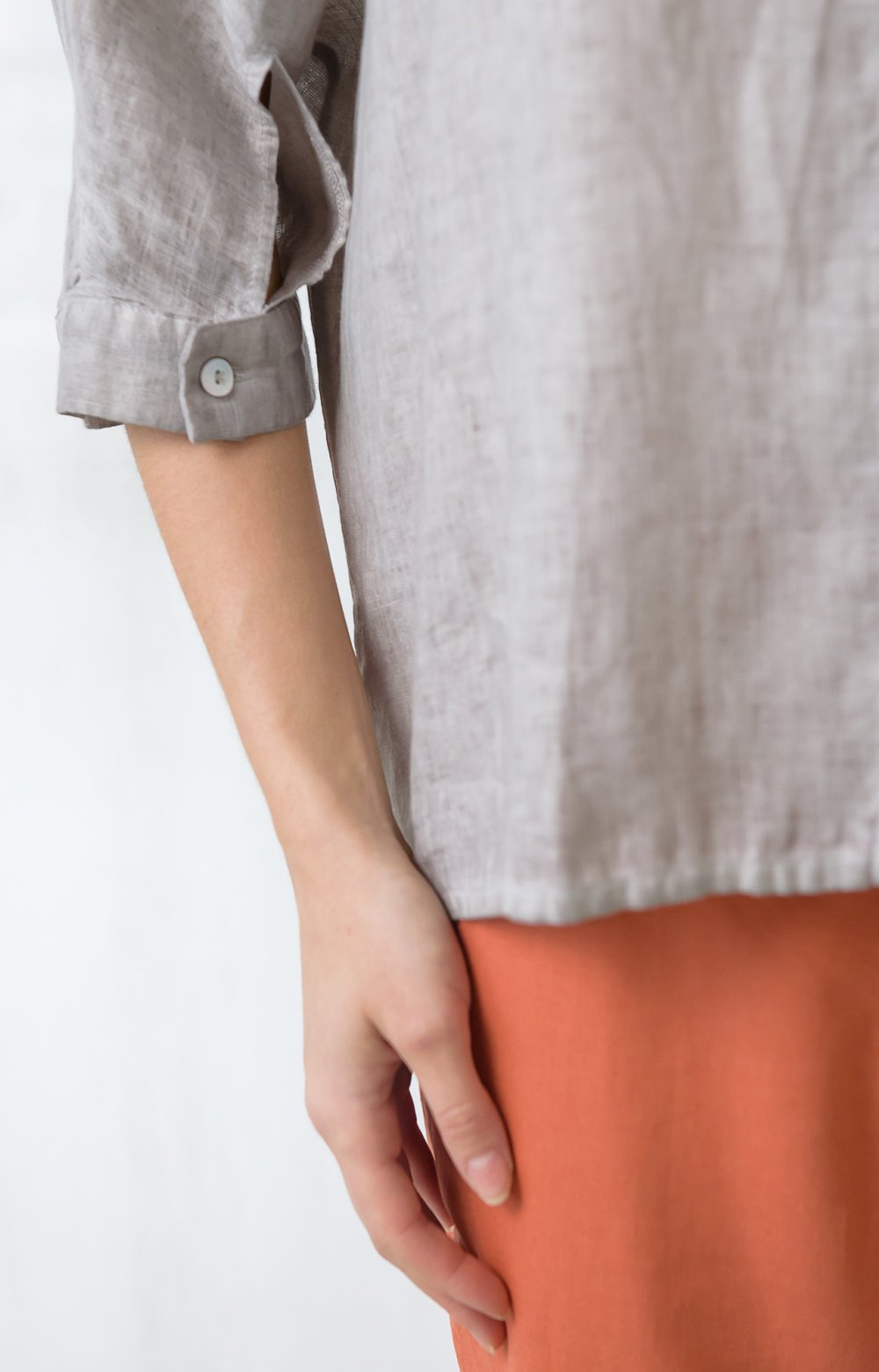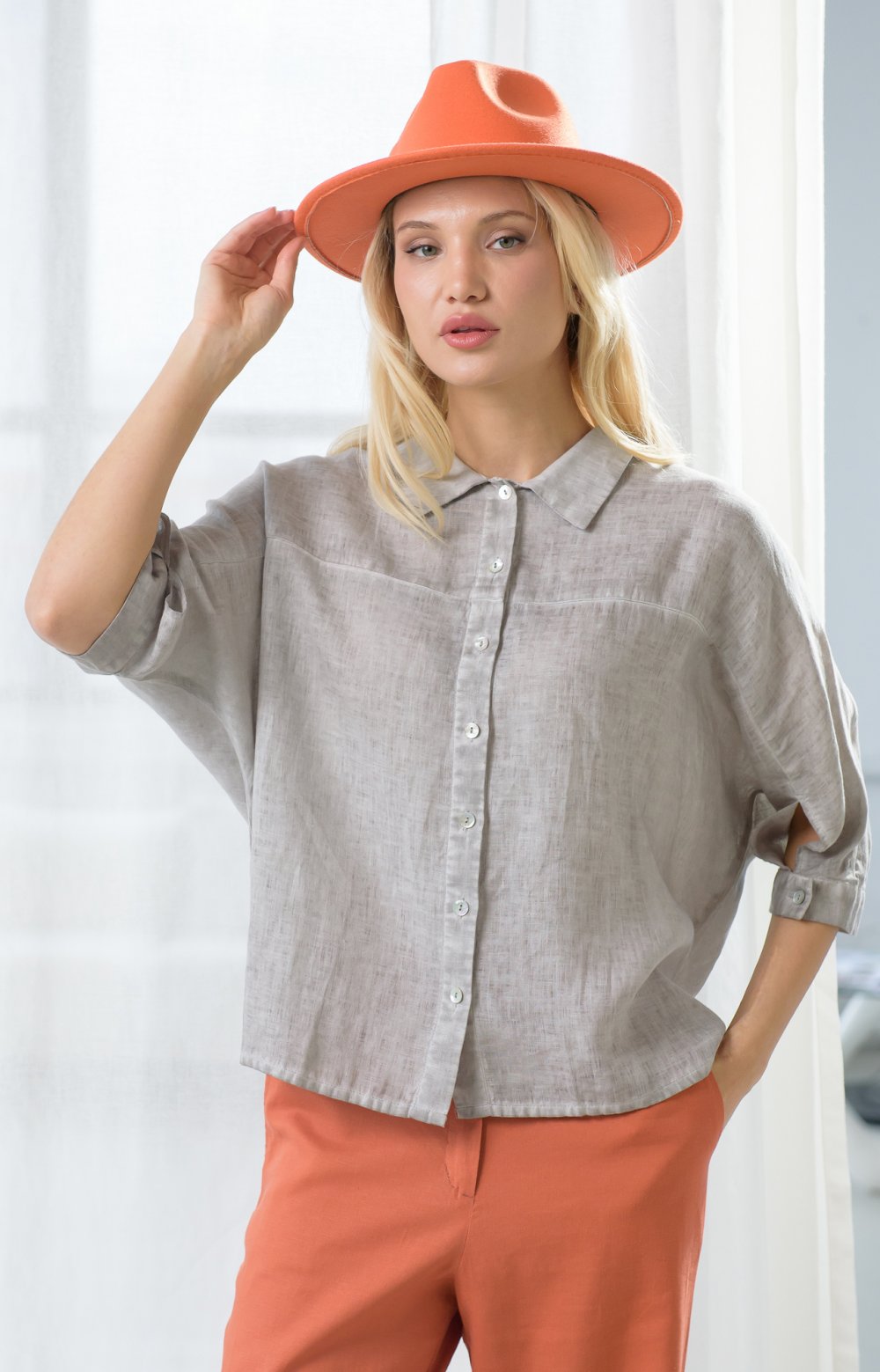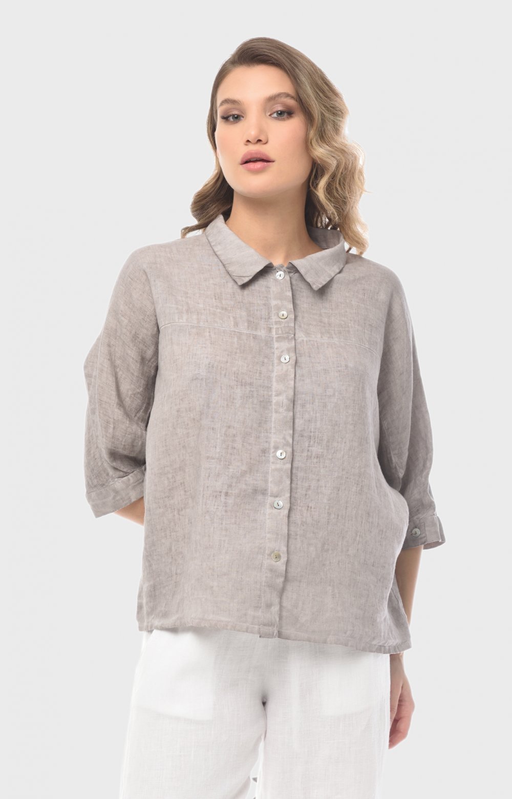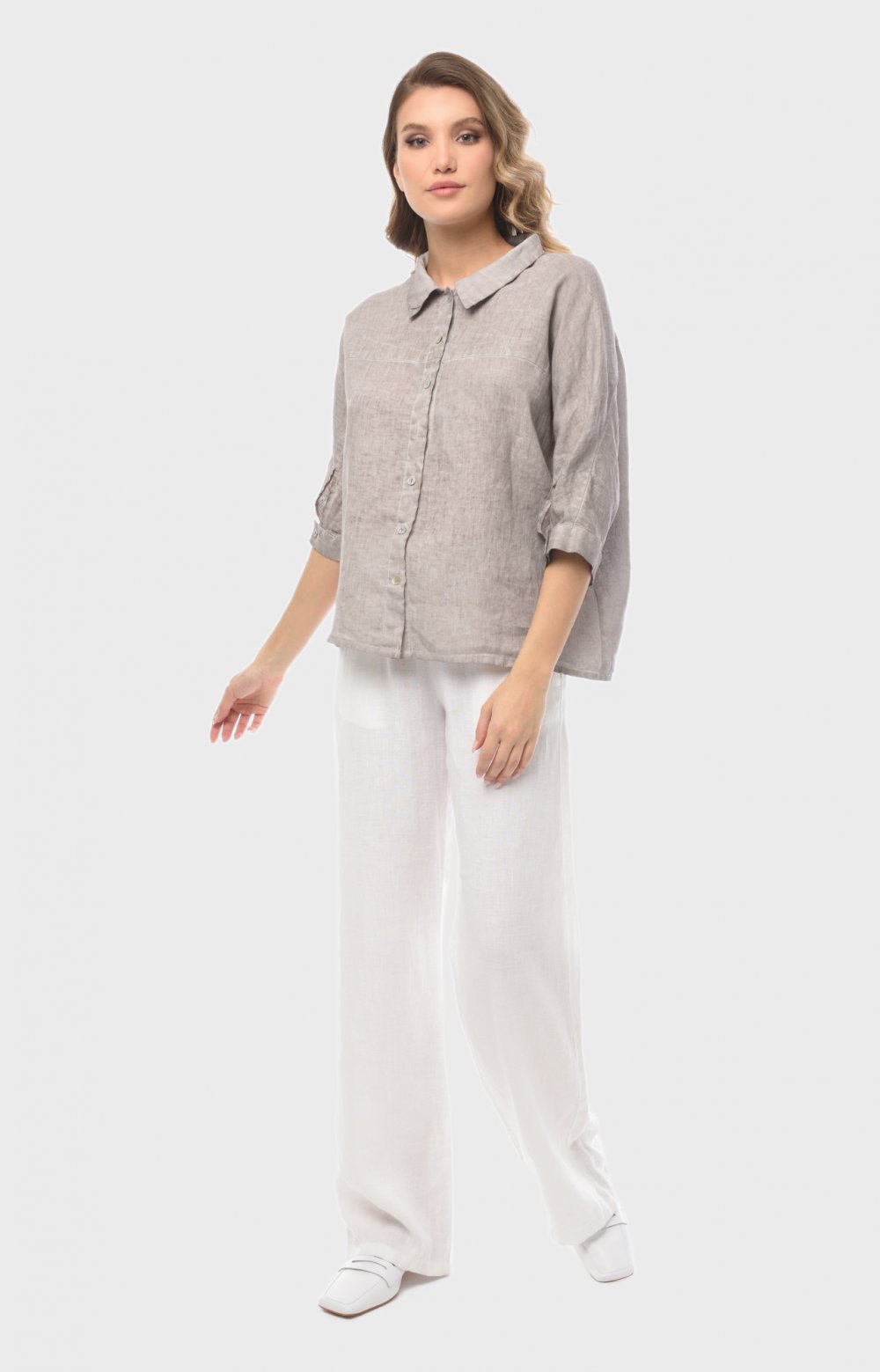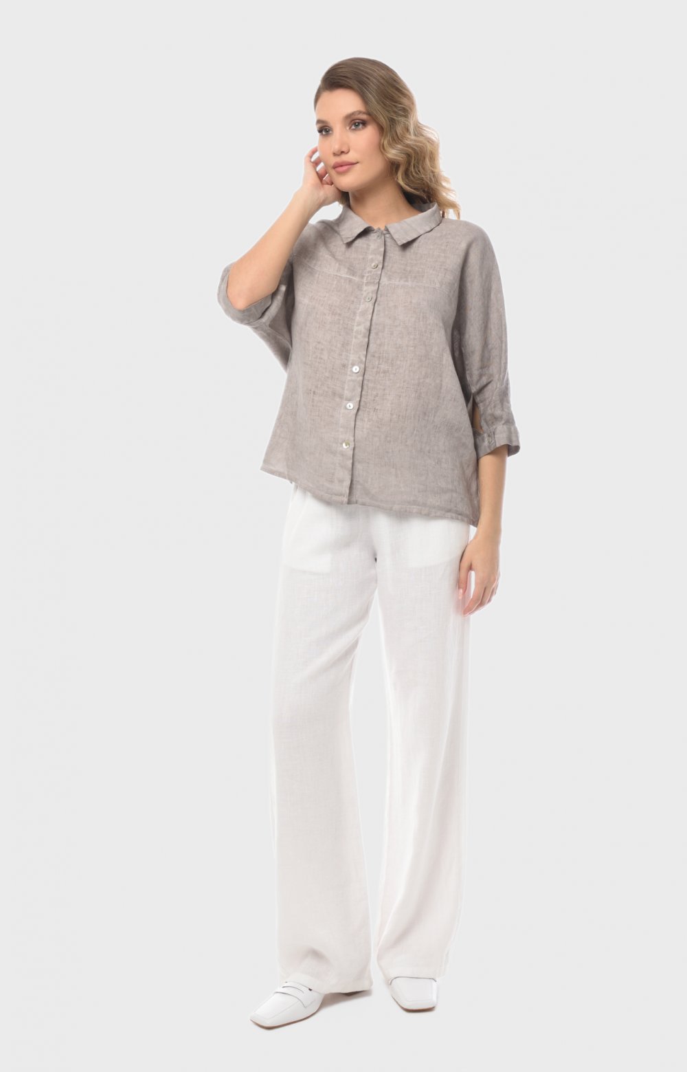 Просторная льняная модель с цельнокроеными рукавами приятно струится по телу, позволяя чувствовать себя комфортно даже в самые жаркие часы. Здесь главную роль играют детали: рез на полочке переходящий в манжет с застежкой спереди, и кулиса на спинке, позволяющая создавать эффектные волнующие драпировки. Окрашивание подчеркивает дизайнерские линии кроя и аутентичную фактуру льняной ткани.