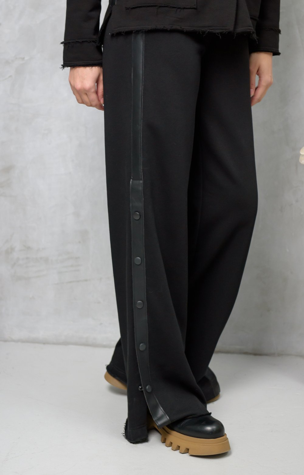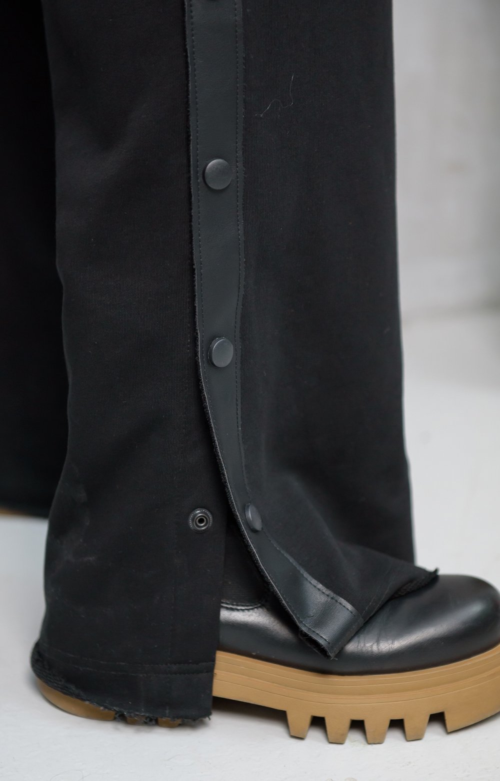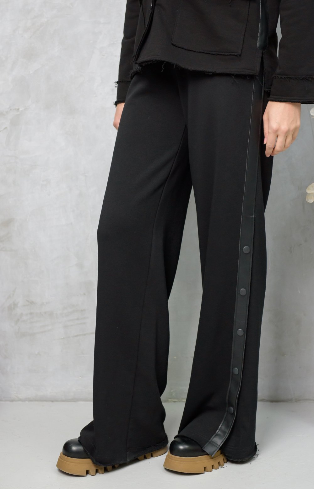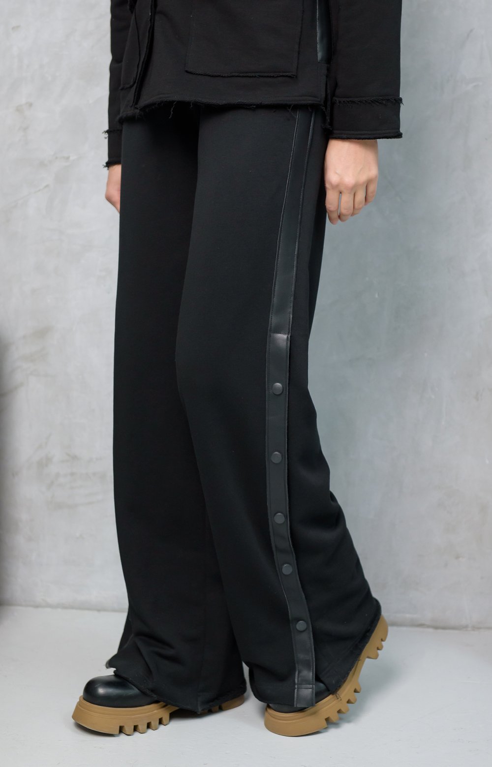 Бенефис - прямые трикотажные брюки глубогого черного цвета можно стилизовать для повседневного или вечернего образа. Стильные и удобные выполнены из плотного трикотажа премиум класса. Эластичная ткань не сковывает движения и хорошо держит форму. Высокая посадка на талии визуально удлиняет пропорции фигуры. Акцентные лампасы из кожзама с высокими разрезами застегиваются на кнопки и позволяют варьировать высоту. Нижний срез изделия не обработан. Пояс с эластичной тесьмой регулирует обьем. Модель подходит любому типу фигуры и комбинируется с различными изделиями. Плотное переплетение делает трикотаж ровным и гладким - благодаря этому брюки со временем не потеряют форму. Ткань создана турецкой фабрикой, которая специализируется на разработке комфортных и практичных материалов высокого качества.