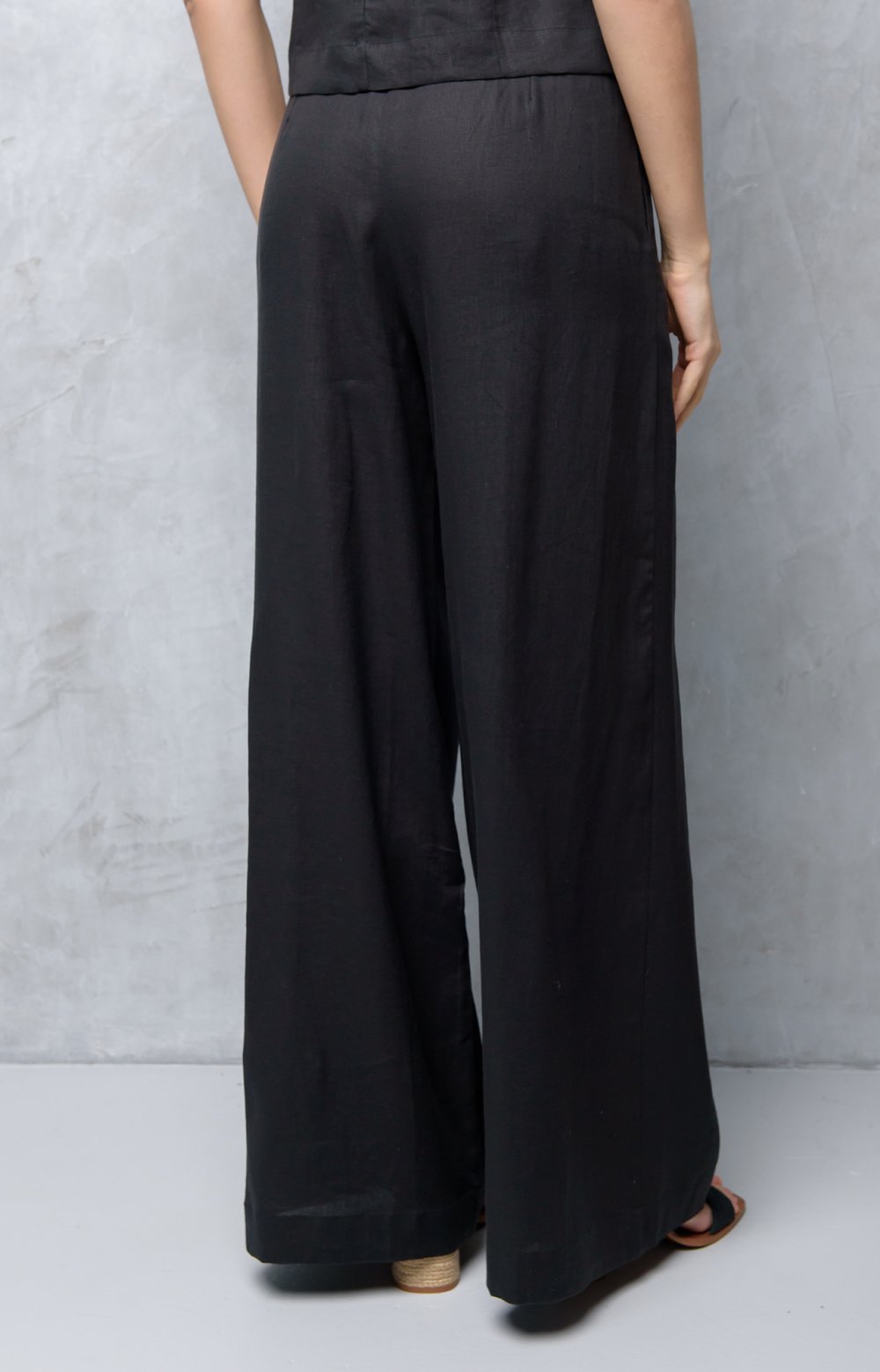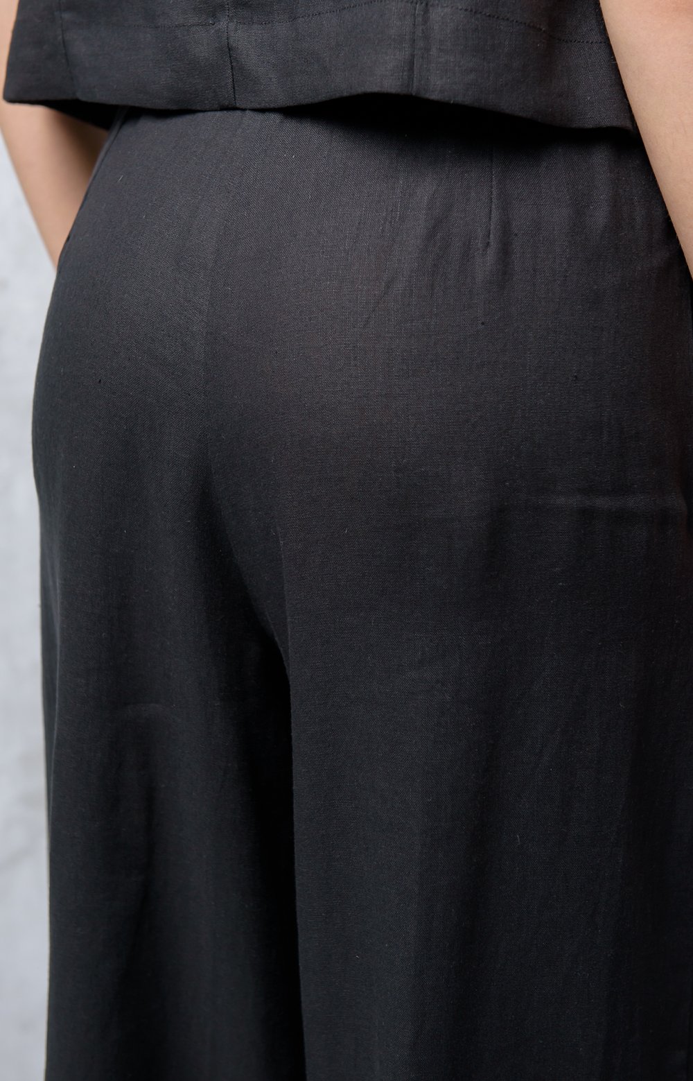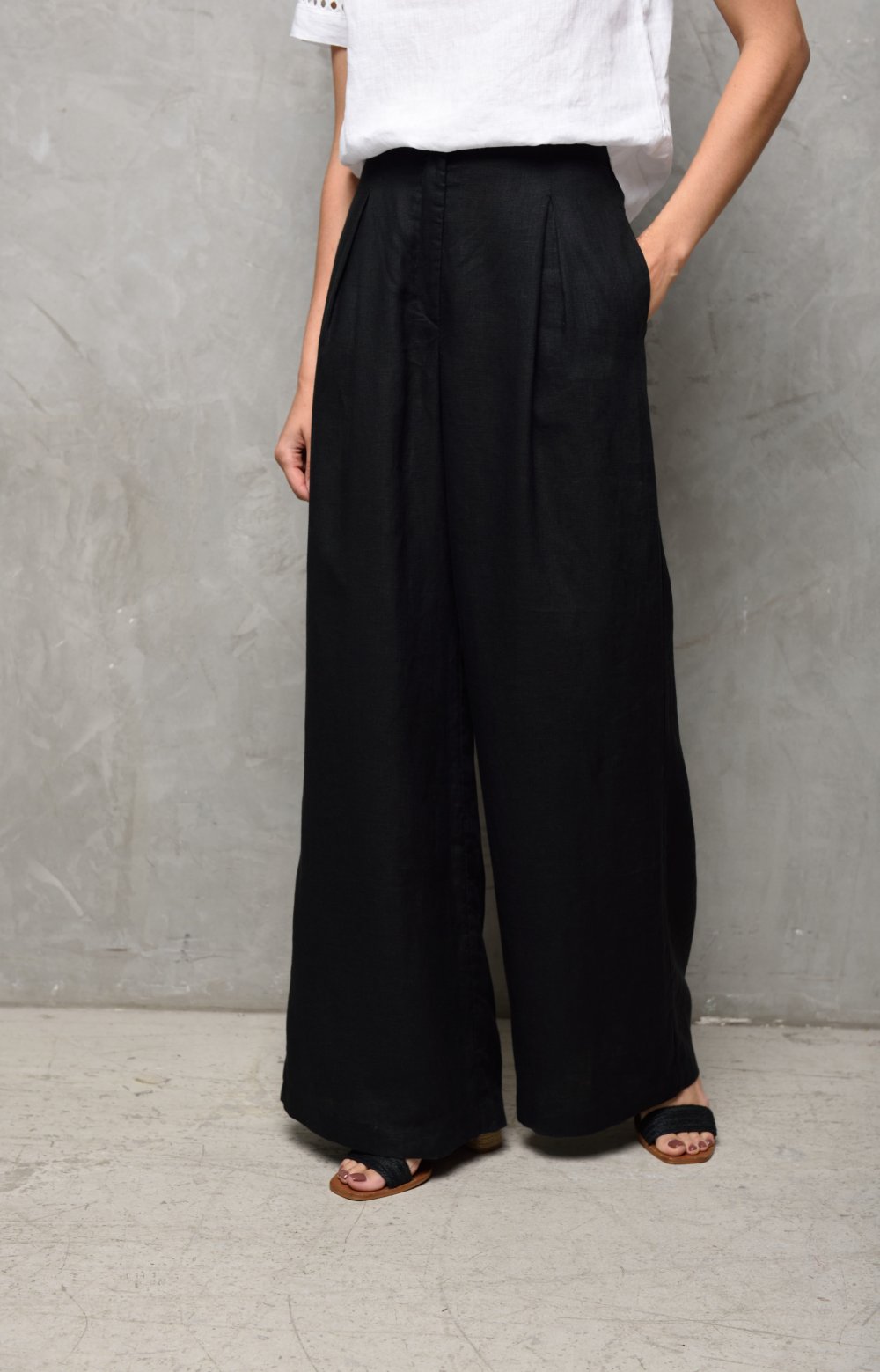 Модельные особенности: силуэт свободный, посадка высокая, складки на поясе фиксированы строчкой и закрепками, застежка на молнию и пуговицы, состав: 100% лен.