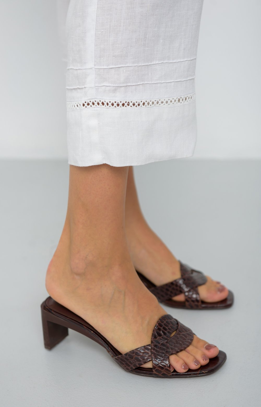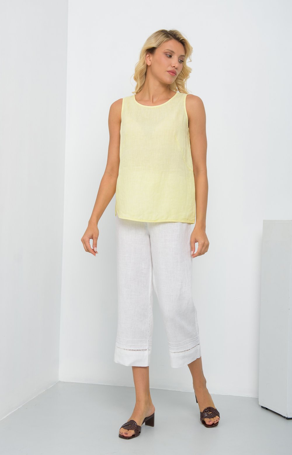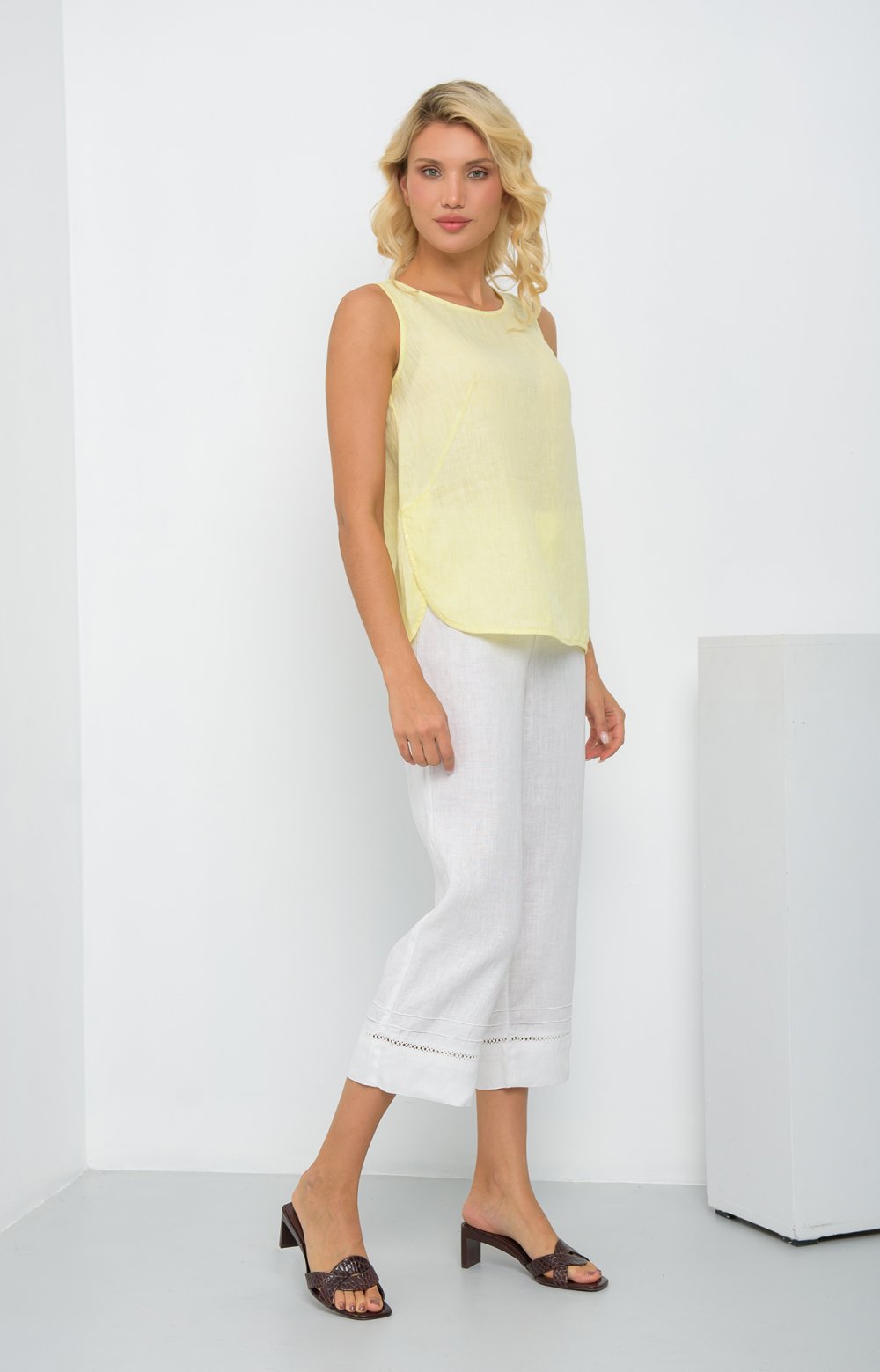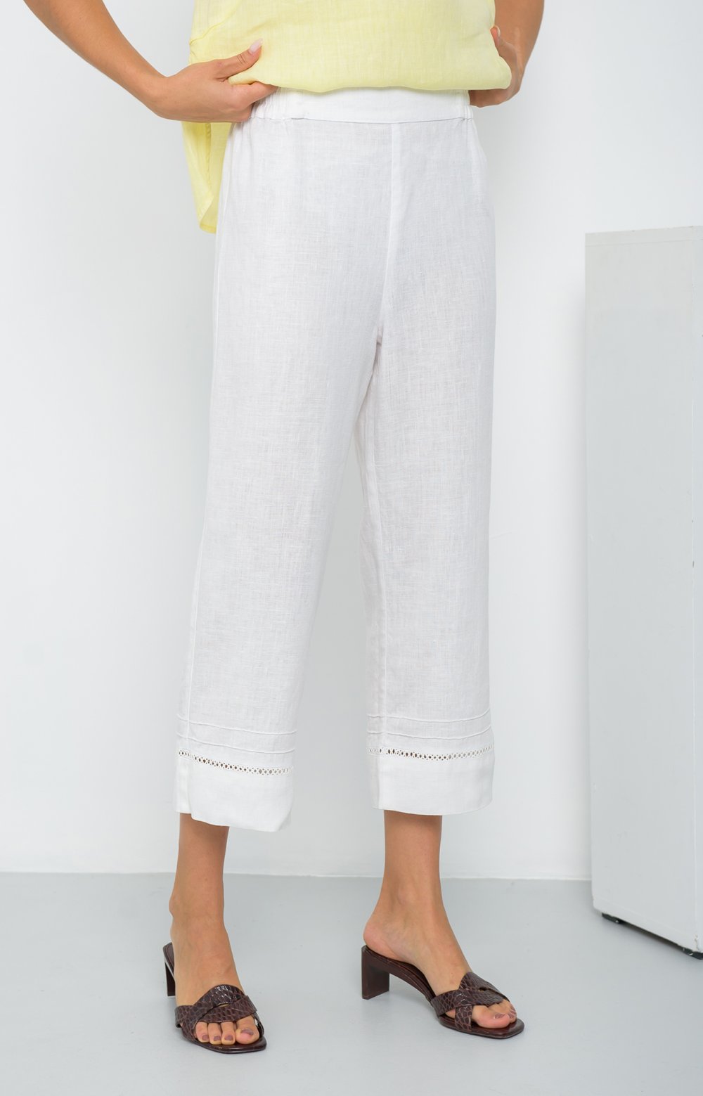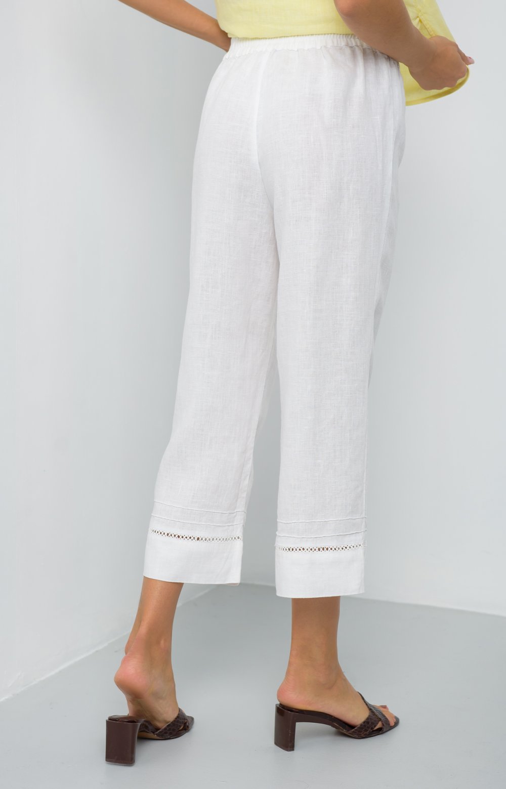 В льняных брюках Ксандер вы будете чувствовать себя максимально комфортно. Укороченная модель с изысканной отделкой добавит расслабленного шика в летний гардероб. Пояс с частичной резинкой отвечает за идеальную посадку модели по фигуре. Без застежки. Акцент перенесен в нижнюю часть изделия. Низ брюк завершен манжетой и украшен мережкой с рядом складочек. Модель окрашена в готовом виде. Способ окрашивания Garment - Dyed. Сочетайте с блузкой Ксандер из нашей коллекции.