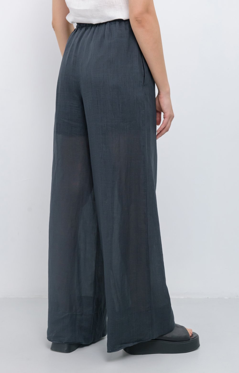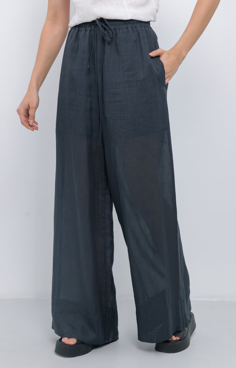 Брюки ЛЕОНОР. Широкие брюки-палаццо с выразительным элегантным силуэтом – это универсальный вариант для вечерних и повседневных комплектов, выразительных образов в различной стилистике. Стильный крой и эффектный полупрозрачный материал подчеркивает грациозность этой модели, в которой ставка сделана на чистые линии. Изделие изготовлено из натурального материала рами, который обладает рядом уникальных качеств: в них вам никогда не будет жарко, ткань гипоаллергенна, обладает природным блеском и отлично держит форму. Для более комфортной посадки модель брюк дополнена шортами. Широкая подгибка низа завершает изделие. Притачной пояс с резинкой обеспечивает отличную посадку по фигуре.