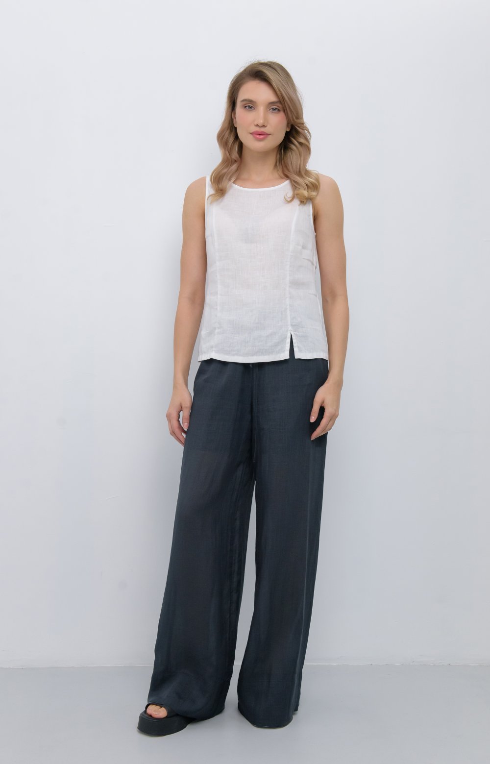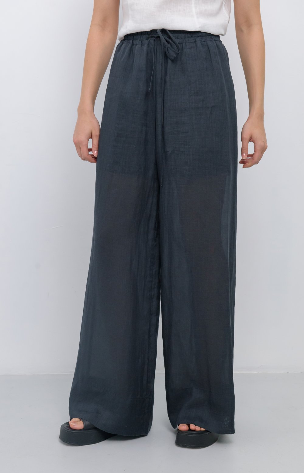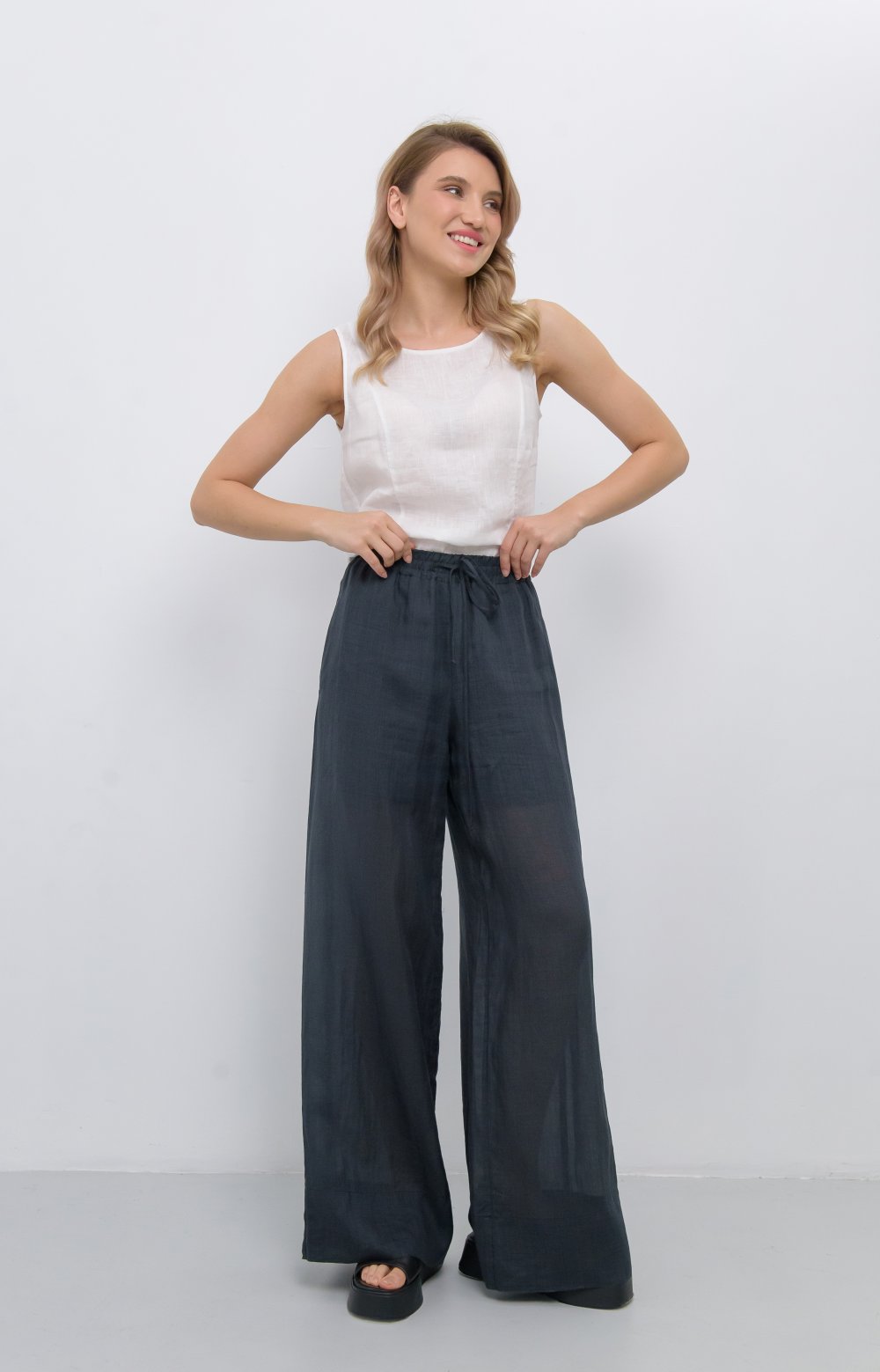 Модельные особенности: силуэт объемный, карманы в боковых швах, в пояс вставлена кулиса, 100% рами-крапива.