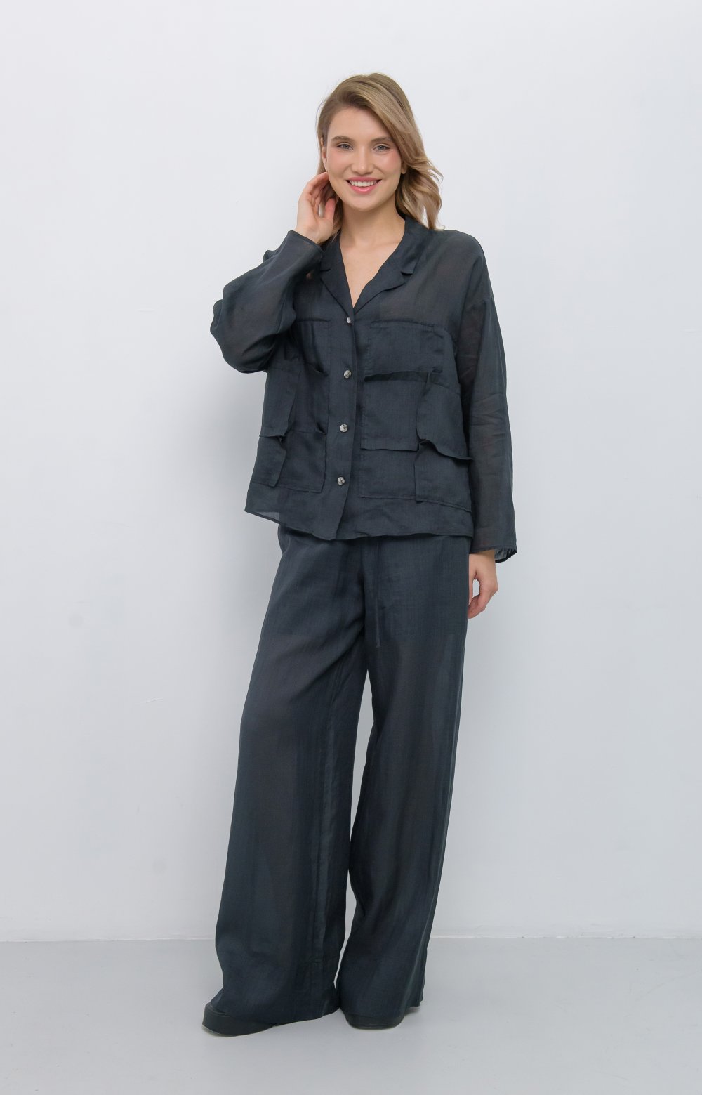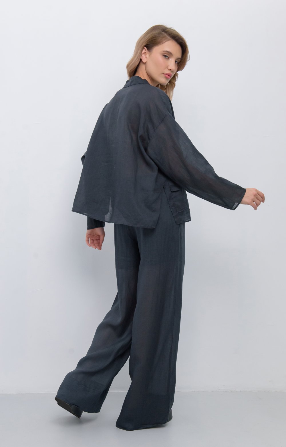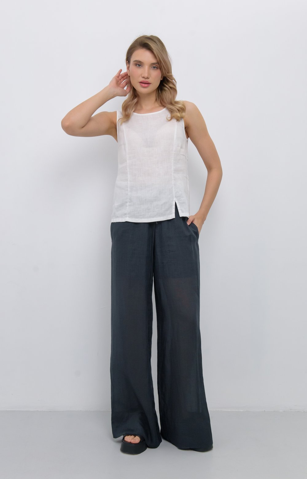 Модельные особенности: силуэт объемный, карманы в боковых швах, в пояс вставлена кулиса, 100% рами-крапива.