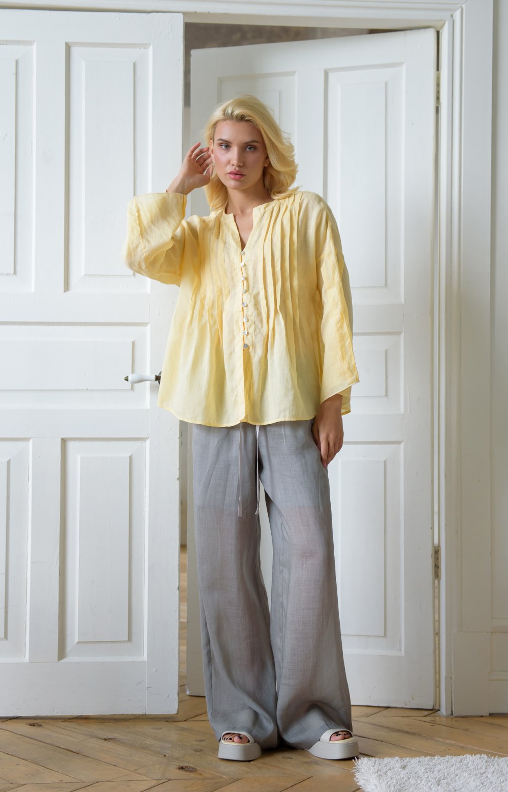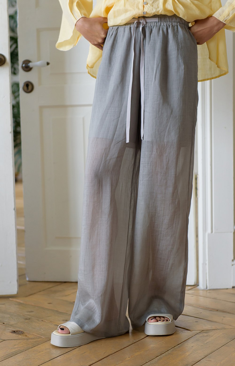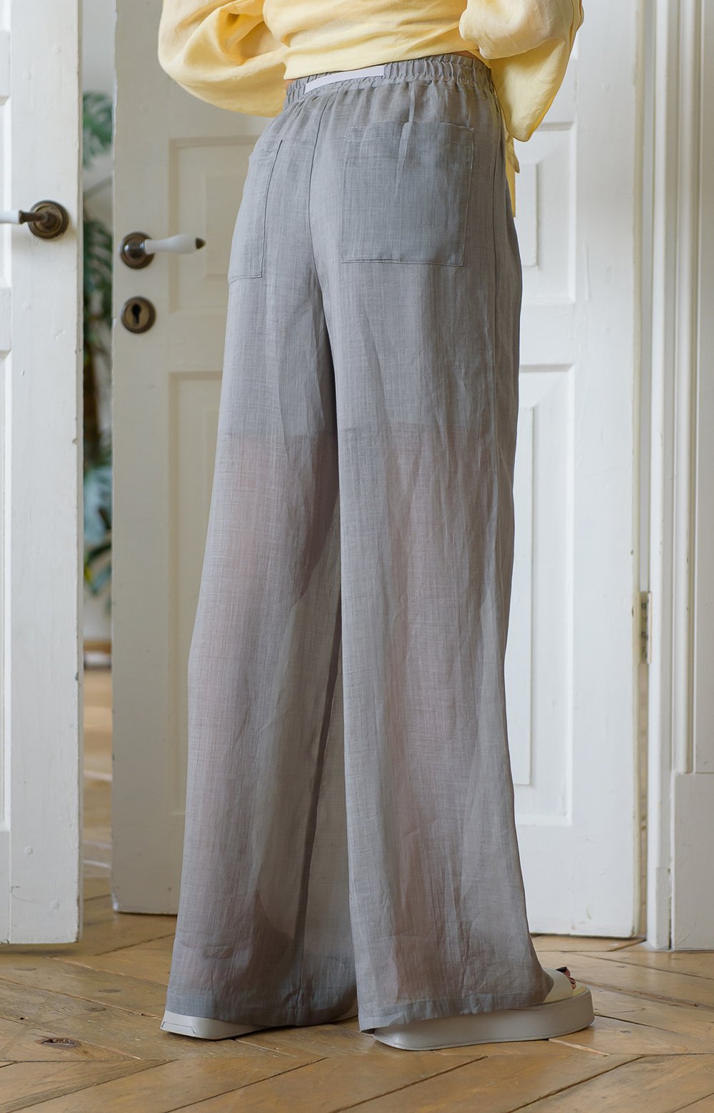 Брюки Марни обладают невероятным шармом и выигрышно смотрятся в любом комплекте. Модель изготовлена из полупрозрачного материала рами. Невесомые брюки помогут чувствовать себя легко даже в самый знойный день. Высокая посадка на талии. Изделие дополнено шортами из тончайшего хлопка. Пояс с широкой резинкой и кулисой из ленты с полукольцами. Накладные карманы на спинке. Без застежки.