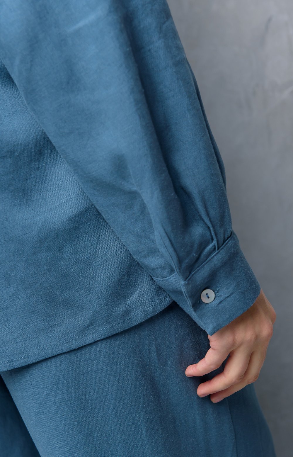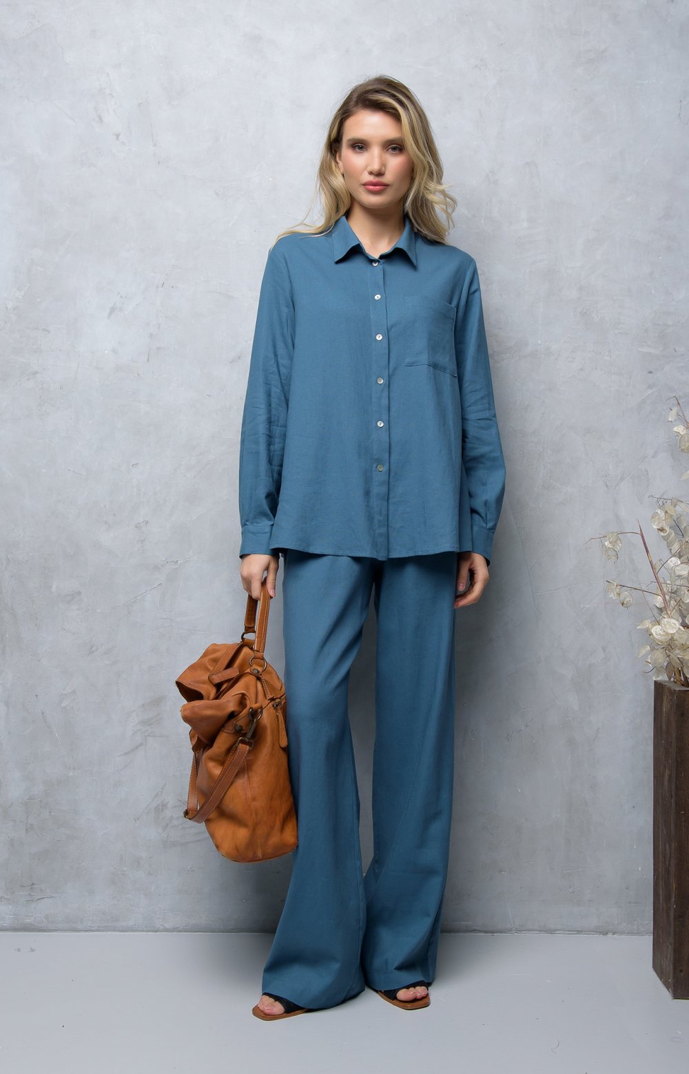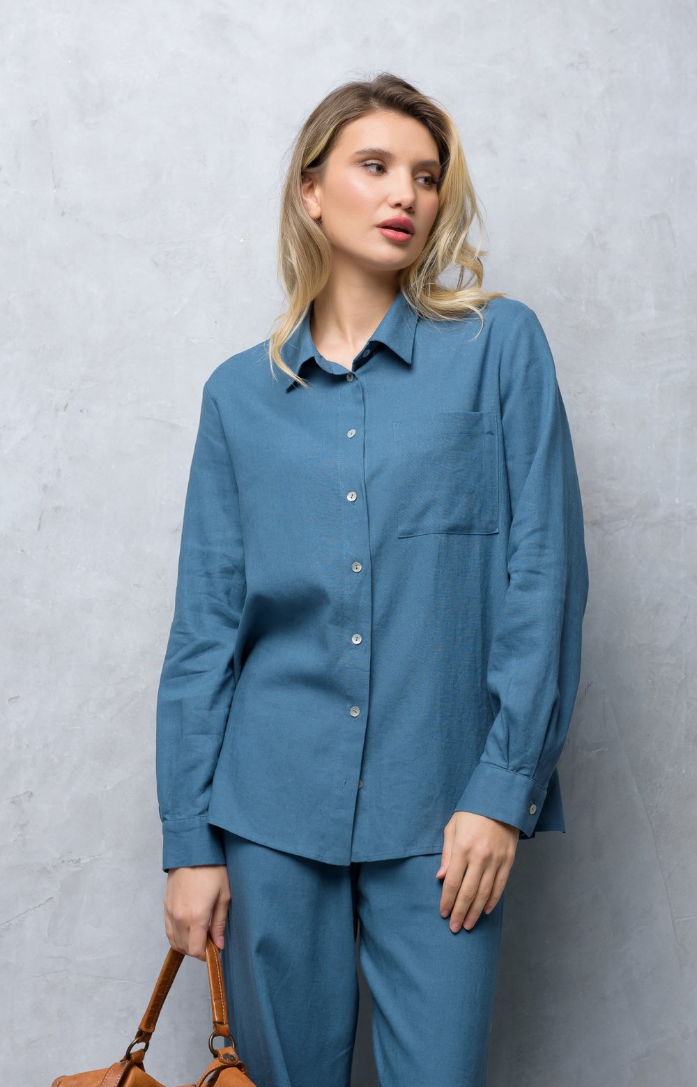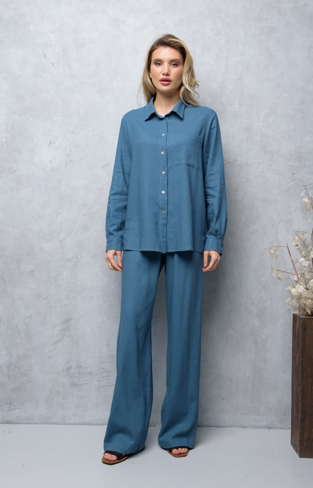 Костюм Марнели - роскошный хит этого лета. В первую очередь благодаря натуральным тканям и удобному крою. Для пошива изделия использована смесовая ткань - лен с вискозой, легкая и струящаяся. Свободная блуза станет стильной основой летних образов в паре с практичными брюками. Крой блузки свободный. Длинный рукав завершен манжетой с застежкой на пуговицу. Полочка дополнена карманом. Разрезы в боковых швах. Прямые брюки с высокой посадкой. В пояс вставлена резинка, поэтому модель без застежки удобно садиться на талии. Пояс с кулисой. Боковые карманы.