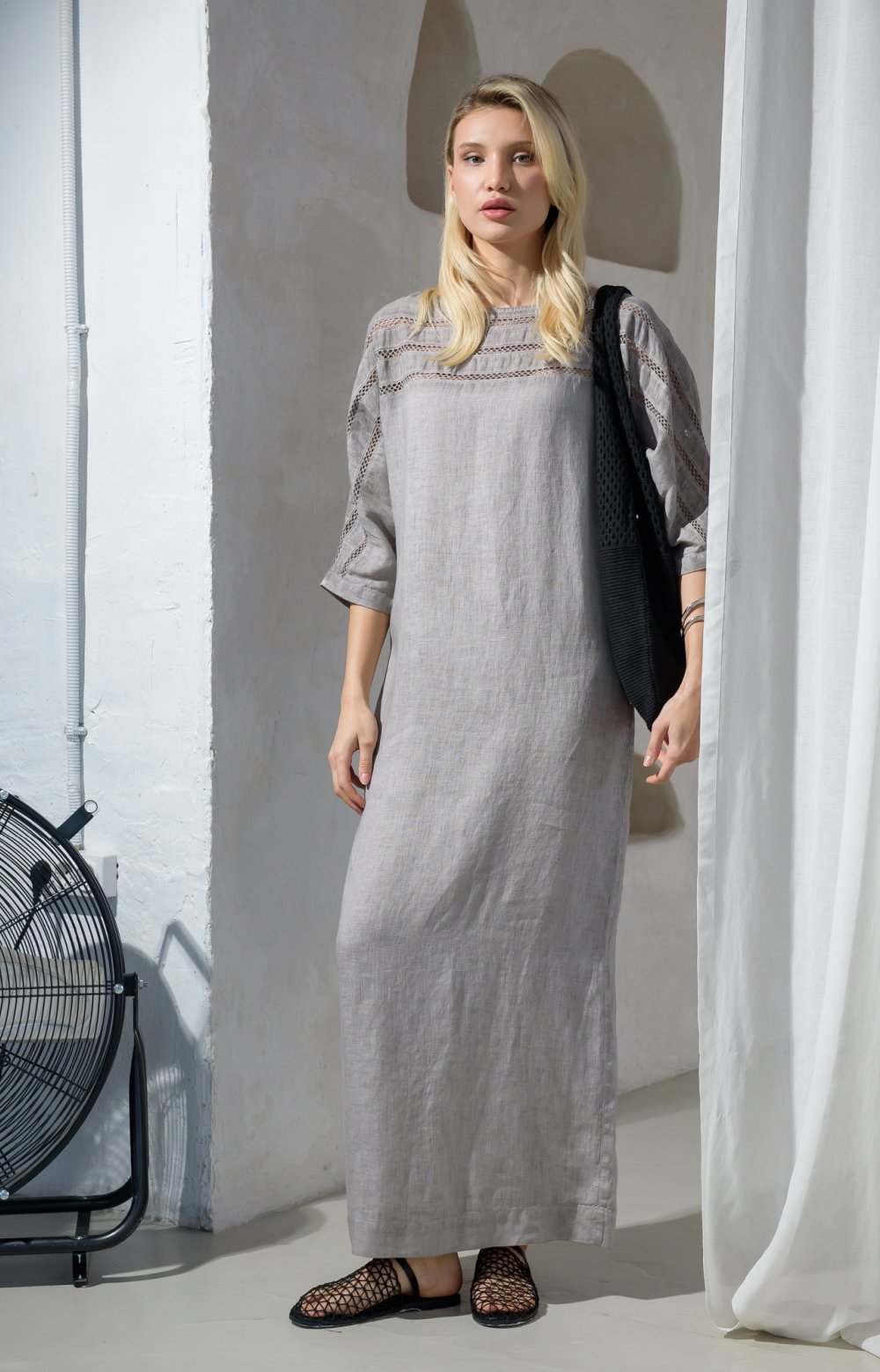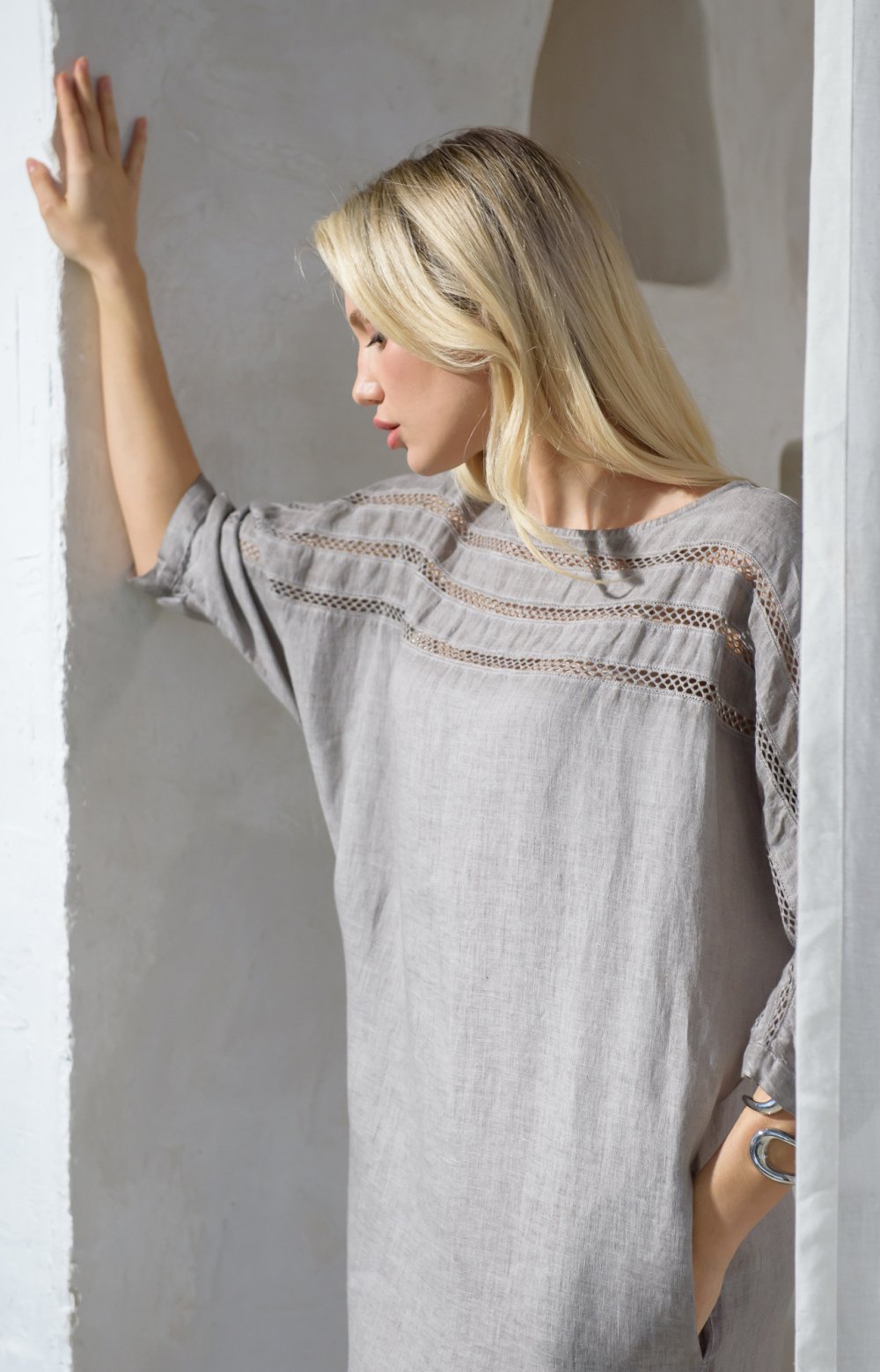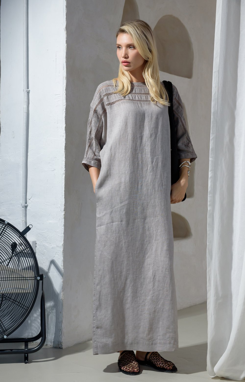 Льняное платье Агата дарит неповторимый комфорт благодаря крою и натуральному умягченному льну. Цельнокроеный рукав "летучая мышь" позволяет скорректировать фигуру и отлично уравновешивает пропорции. Полочку украшает ажурное кружево. Рукав завершен узкой манжетой. Карманы в боковых швах. Высокий разрез на спинке.