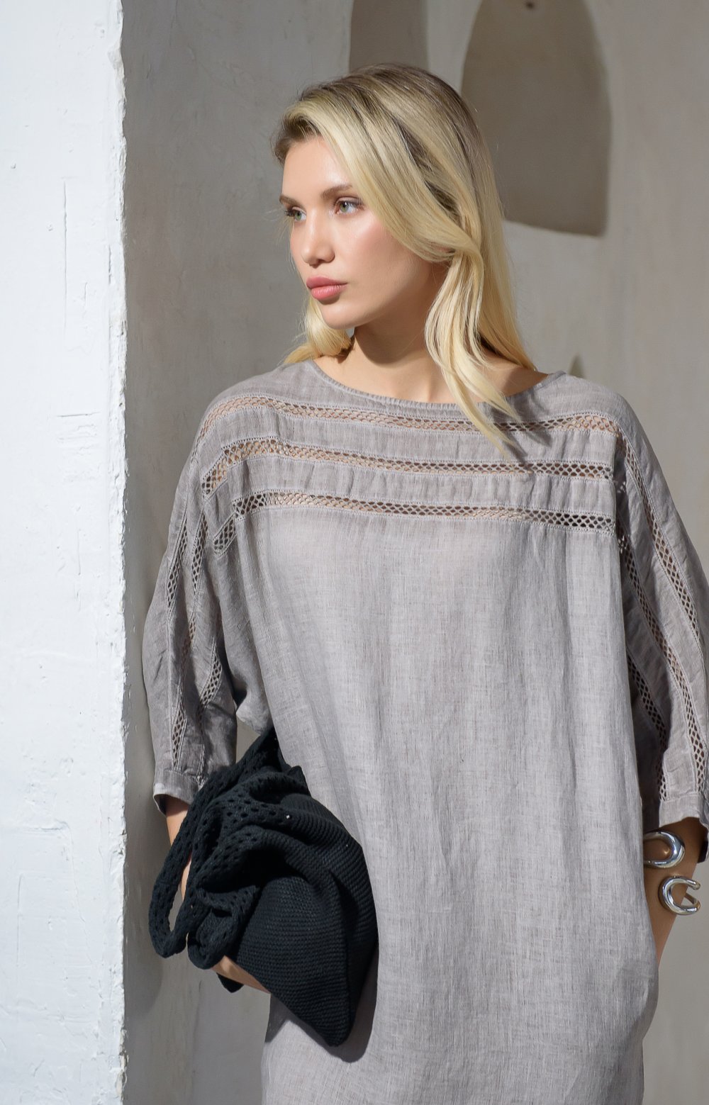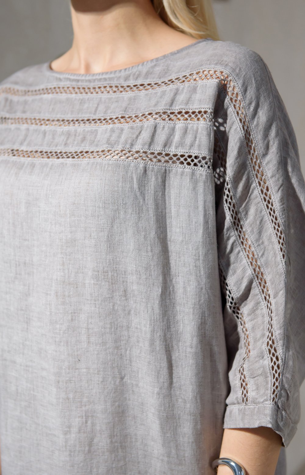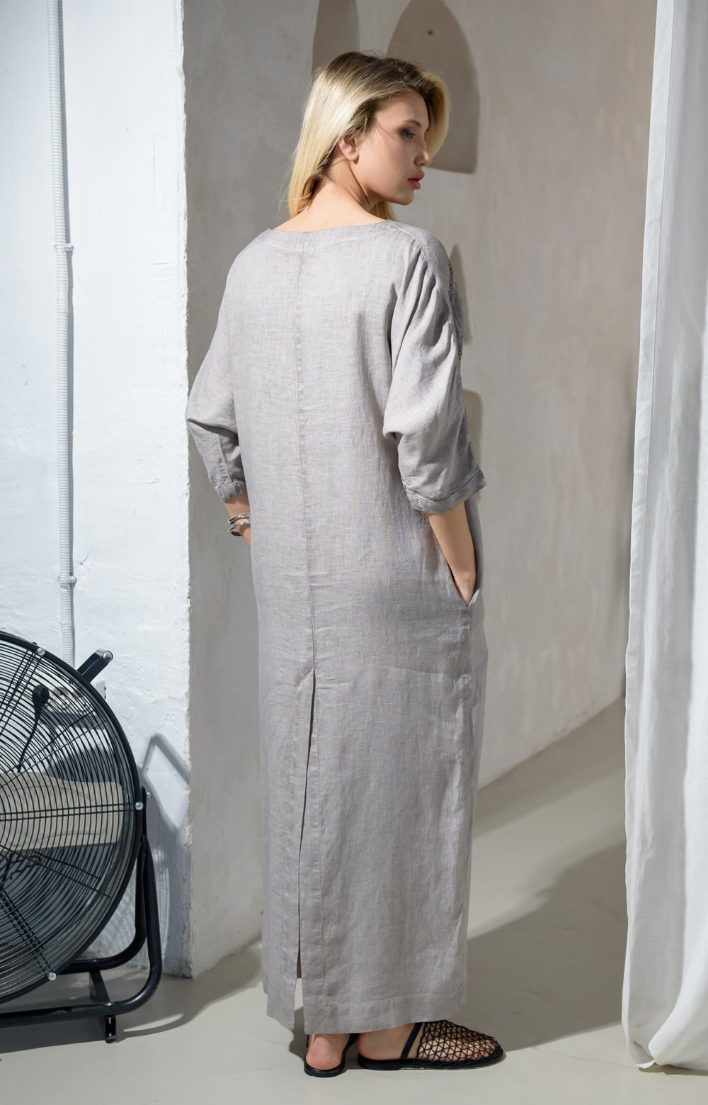 Льняное платье Агата дарит неповторимый комфорт благодаря крою и натуральному умягченному льну. Цельнокроеный рукав "летучая мышь" позволяет скорректировать фигуру и отлично уравновешивает пропорции. Полочку украшает ажурное кружево. Рукав завершен узкой манжетой. Карманы в боковых швах. Высокий разрез на спинке.