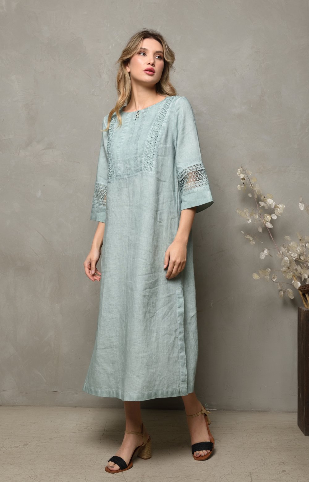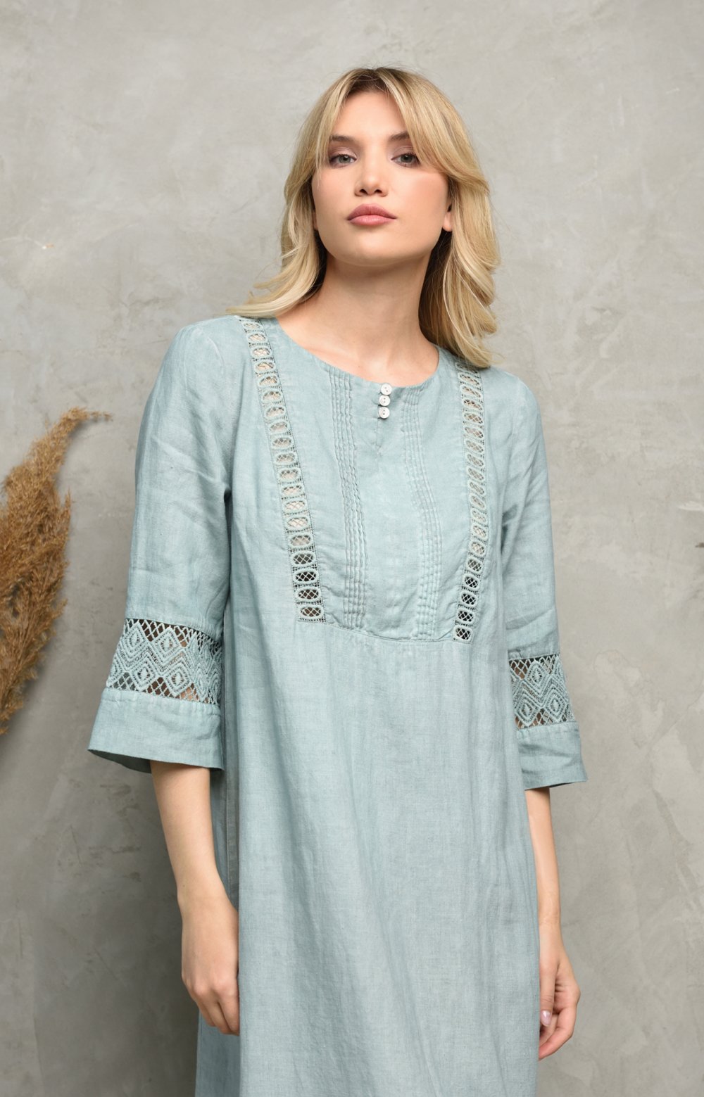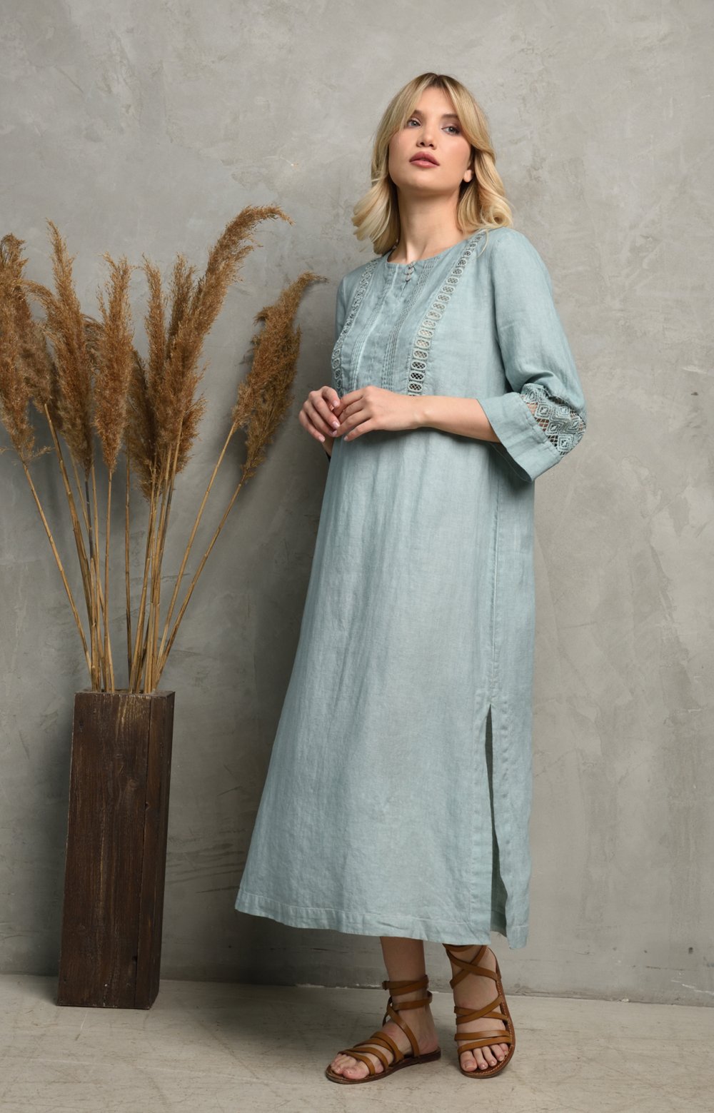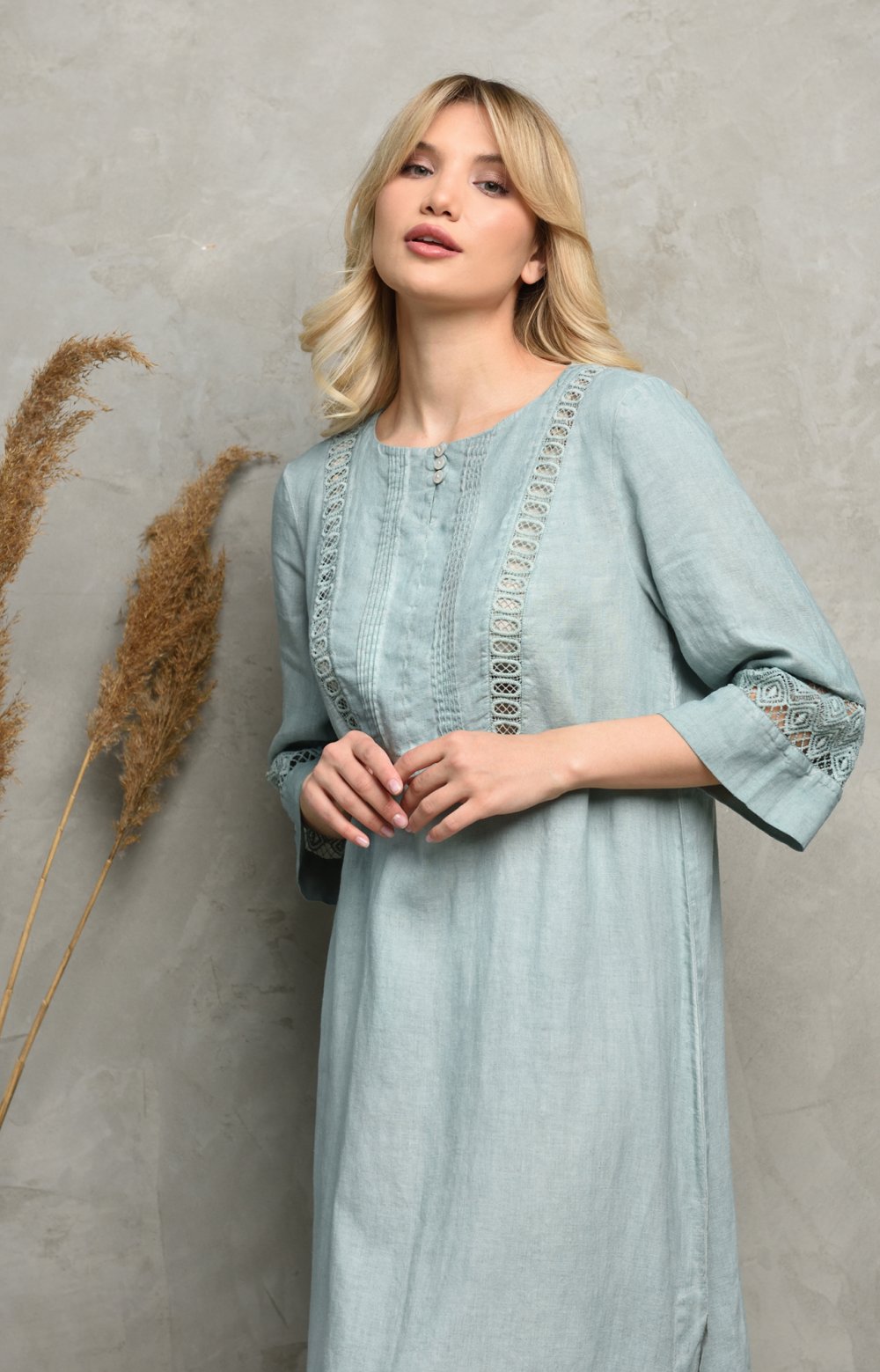 Платье Аврора – образец женственности. Идеальный силуэт в сочетании с изысканным дизайном и утонченным итальянским кружевом – это стиль для истинных женщин. Полочка украшена пластроном с кружевом и рядом небольших складочек. Горловина округлой формы оформлена небольшим разрезом и тремя пуговицами с навесными петлями. На спинке расположена кокетка с кружевом.