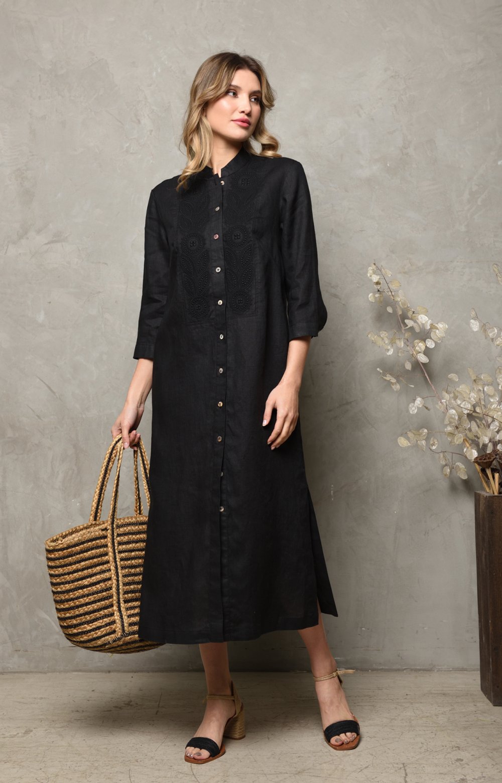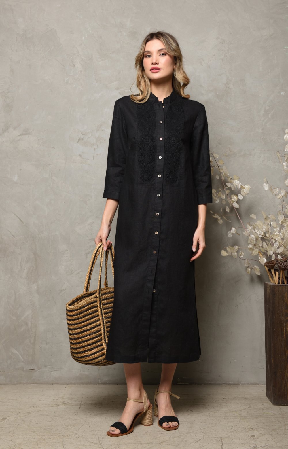 Выбирайте комфорт и чистоту стилевых решений. Легкие сандалии и плетеная сумка подчеркнут натуральную красоту льняного платья Милано.