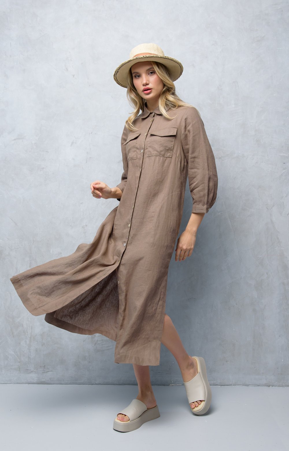 Модельные особенности: силуэт прямой, длина миди, нагрудные вытачки, карманы в боковых швах с фигурной строчкой, состав: 100% умягченный лён.